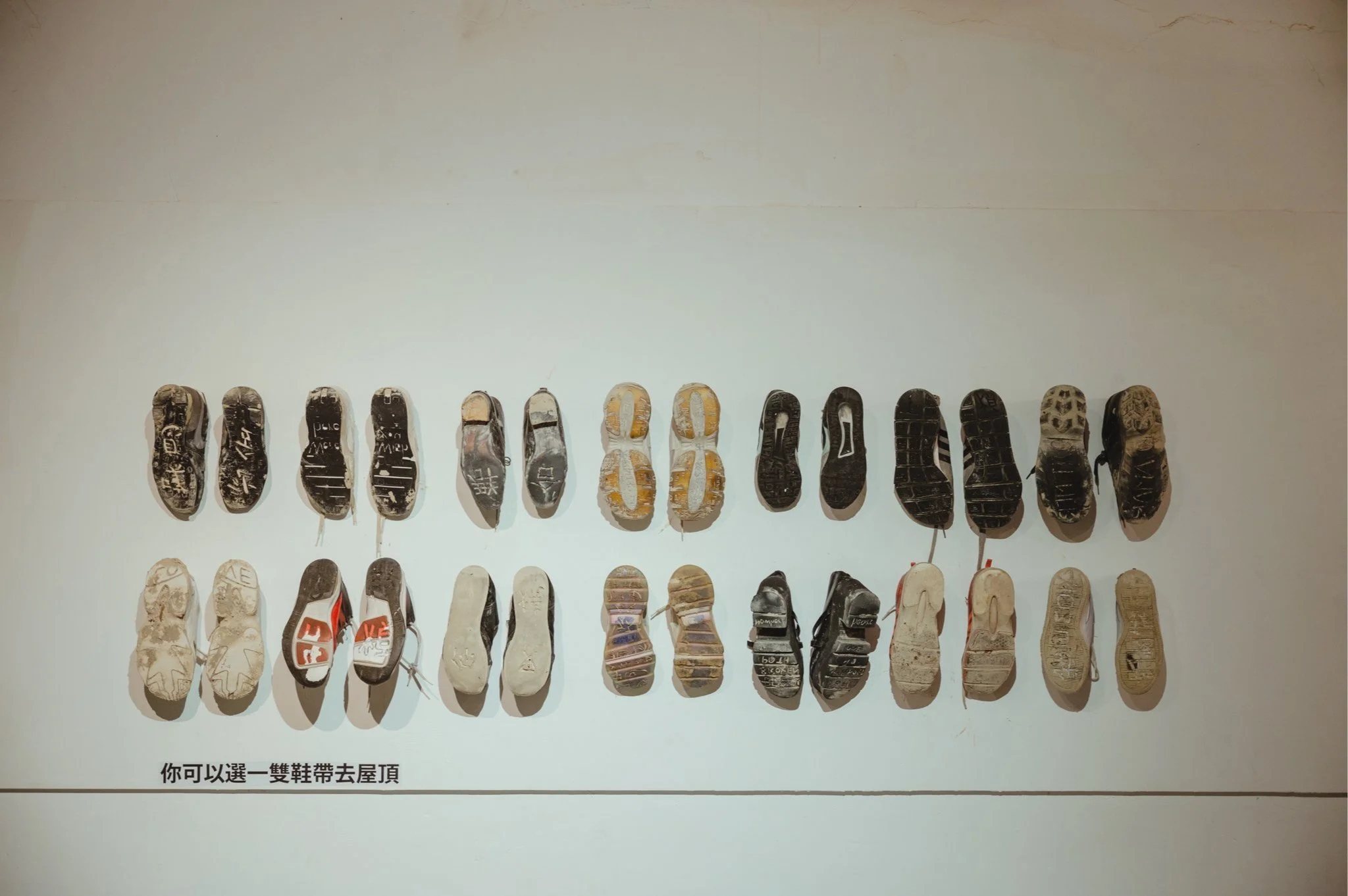 6 Danny Young, 2025, Rooted in Thought 根植於思緒, carved trainers, pigmented water, installation, dimensions variable